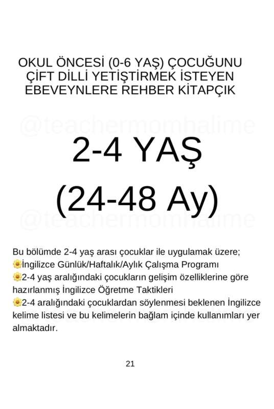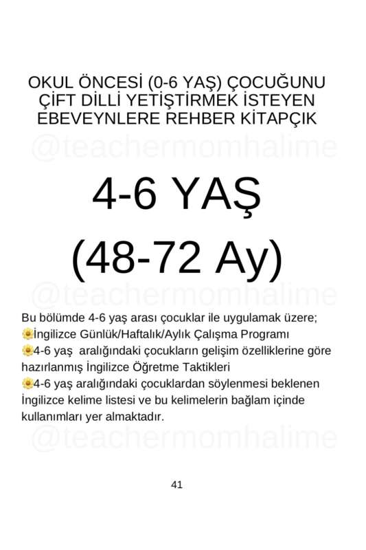 0-6 yaş çocuklara ve okul öncesi öğrencilerine İngilizce öğretmek için hazırlanmış 62 sayfalık dijital rehber kitapçık. Hazır İngilizce programlarla, kelimeler ve pratik cümlelerle, pratik uygulama taktikleriyle çocuklarla İngilizceyi eğlenceli ve doğal bir şekilde deneyimleyin.