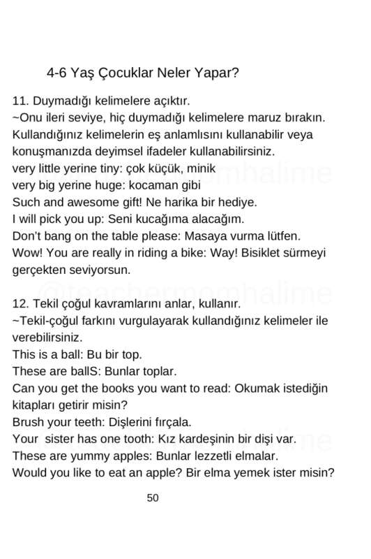 – 0-6 yaş (her yaş grubu için ayrı) 50’şer kelime ve bu kelimelerin bağlam içinde kullanımları bulacaksınız.