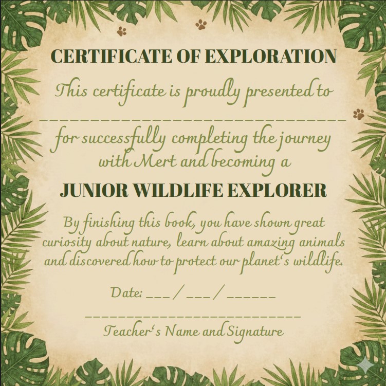 - 🏆 BONUS 3 – Certificate: Kitabı bitiren minik kaşifler için isme özel düzenlenebilir “Junior Wildlife Explorer Başarı Sertifikası”.
